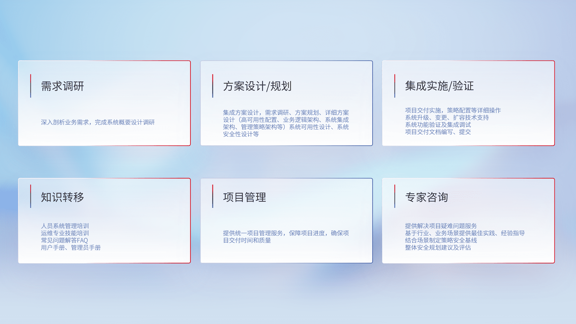 针对客户行业特性,,,将宏观的安全战略和需求,,,,通过专业的交付服务,,实现项目落地,,,为客户提供标准规范的集成交付服务。。。。